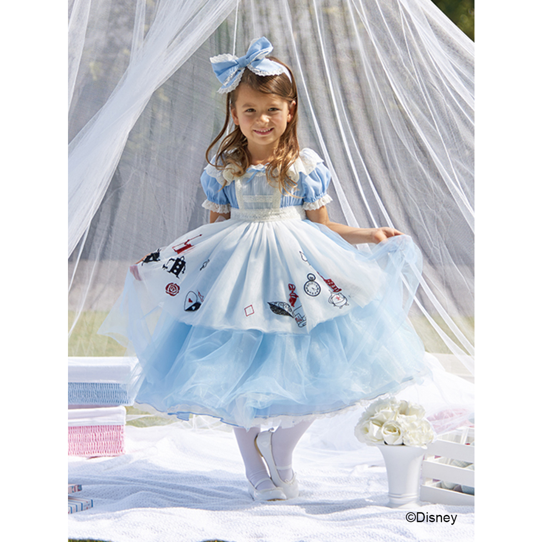 アリスの服装は裾の広がったスカートとエプロンからなるエプロンドレス(ピナフォー)。袖はパフスリープ、エプロンの裾にフリルがつき、その後ろに大きなリボン結びが付けられてます。